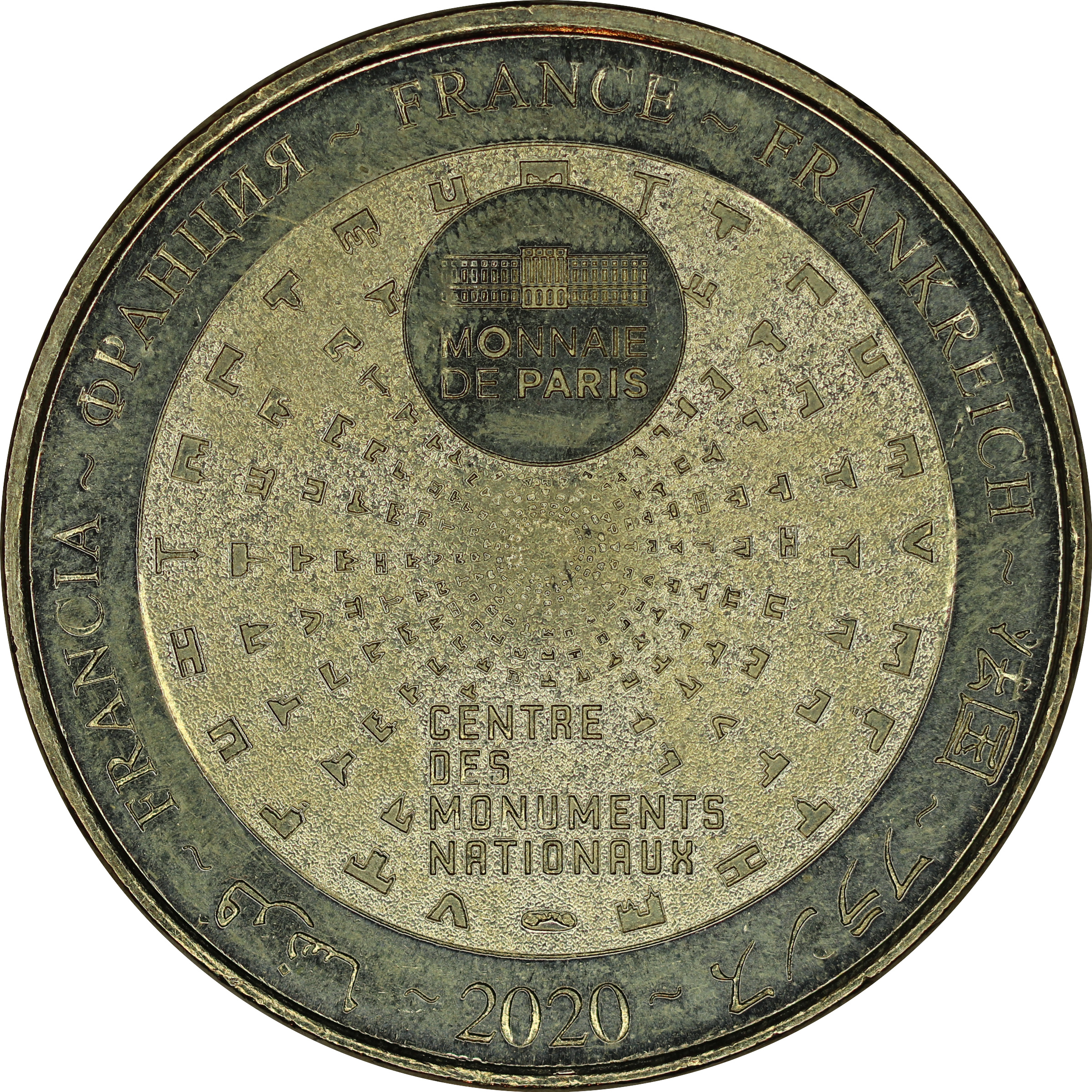 Описание: На периферії слово «Франція» написано сімома мовами. У положенні «12 годин» зображено будівлю Monnaie de Paris у колі. Піктограми Centre des Monuments Nationaux сходяться в центрі.