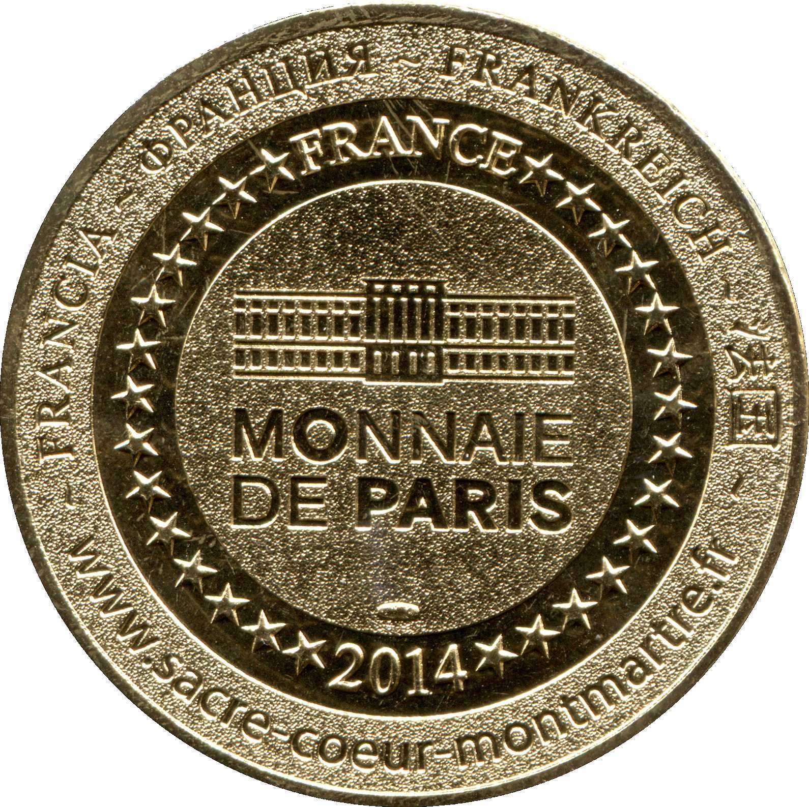 Описание: На периферії слово «Франція» написано вісьмома мовами. Франція на 12-й годині, 2014 рік на 6-й годині, все пов'язане 14 зірками праворуч і ліворуч. У центрі — будівля Монетного двору Парижа.