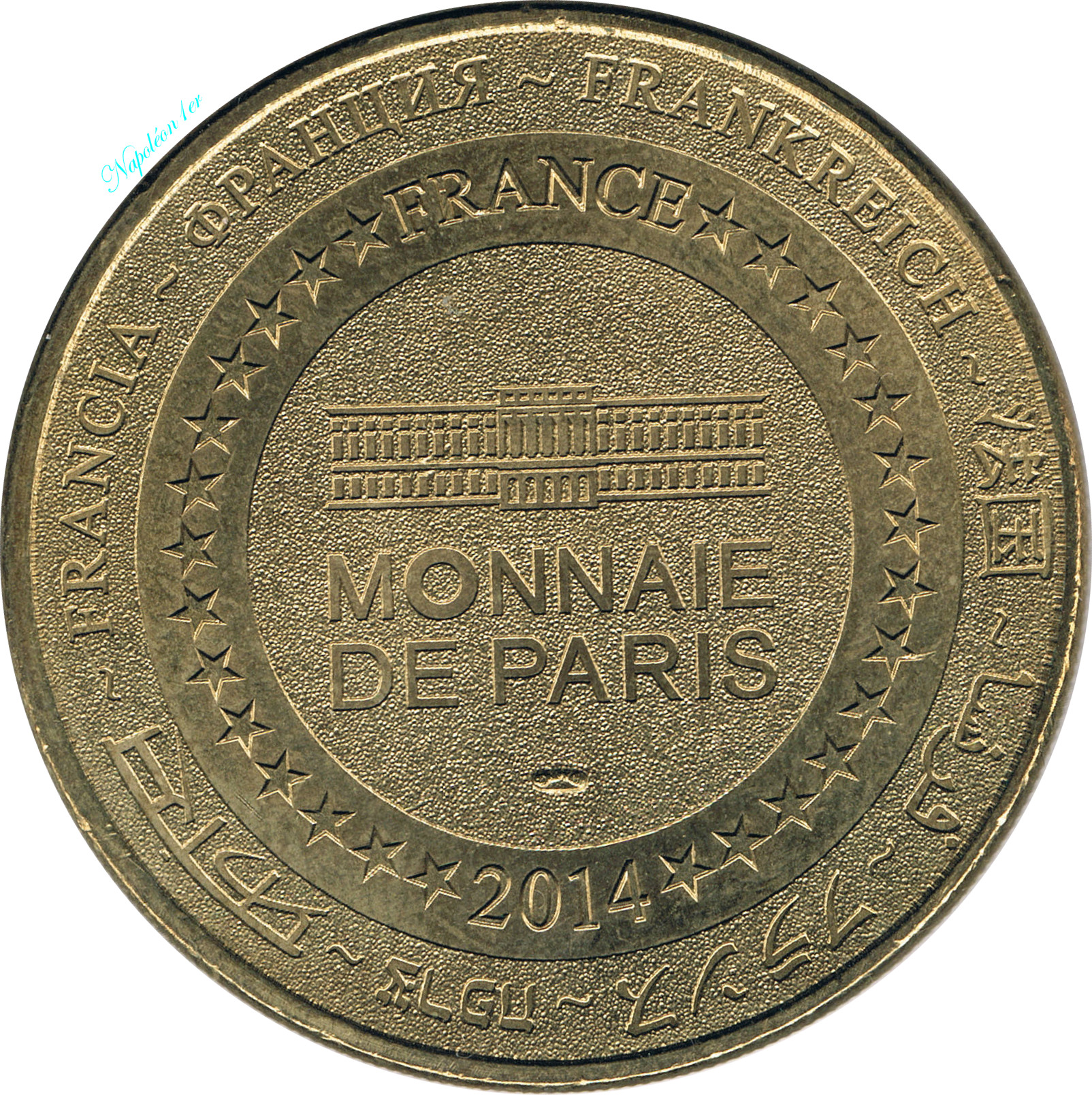 Описание: На периферії слово «Франція» написано вісьмома мовами. Франція на 12-й годині, 2014 рік на 6-й годині, все пов'язане 14 зірками праворуч і ліворуч. У центрі — будівля Monnaie de Paris. Слово «PARIS» має бути вирівняне для випуску 2014 року.