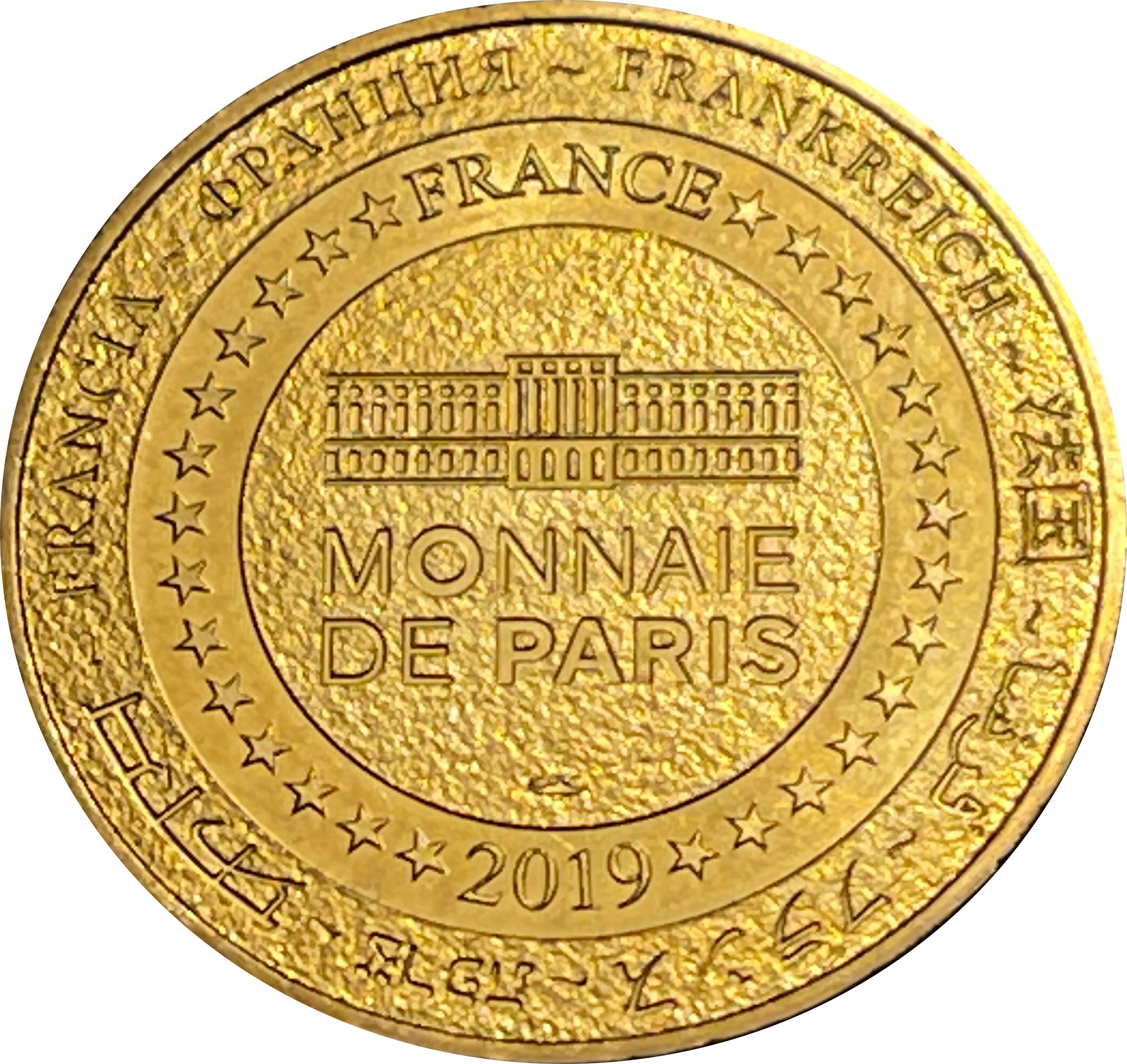 Описание: На периферії слово «Франція» написано вісьмома мовами. Франція на 12-й годині, 2019 рік на 6-й годині, все пов'язане 14 зірками праворуч і ліворуч. У центрі — будівля Монетного двору Парижа.