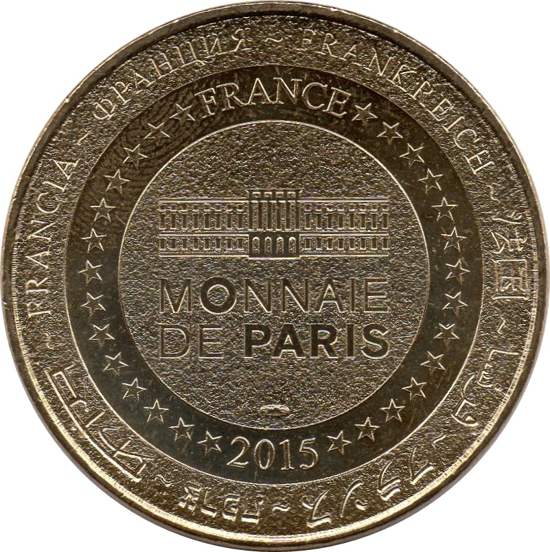 Описание: На периферії слово «Франція» написано вісьмома мовами. Франція на 12-й годині, 2014 рік на 6-й годині, все пов'язане 14 зірками праворуч і ліворуч. У центрі — будівля Моне-де-Парі.