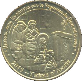 Туристична монета Monnaie de Paris — Лурд («Щасливі ви, бідні, бо Царство Боже належить вам»)