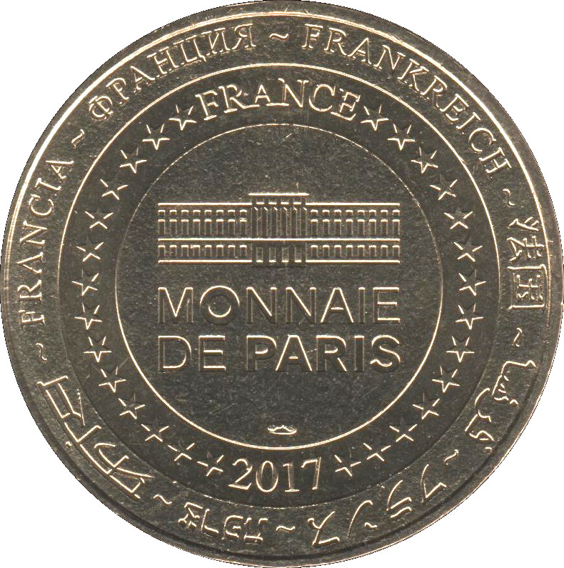 Описание: На периферії слово «Франція» написано вісьмома мовами. Франція на 12-й годині, 2017 рік на 6-й годині, все пов'язане 14 зірками праворуч і ліворуч. У центрі — будівля Моне-де-Парі.