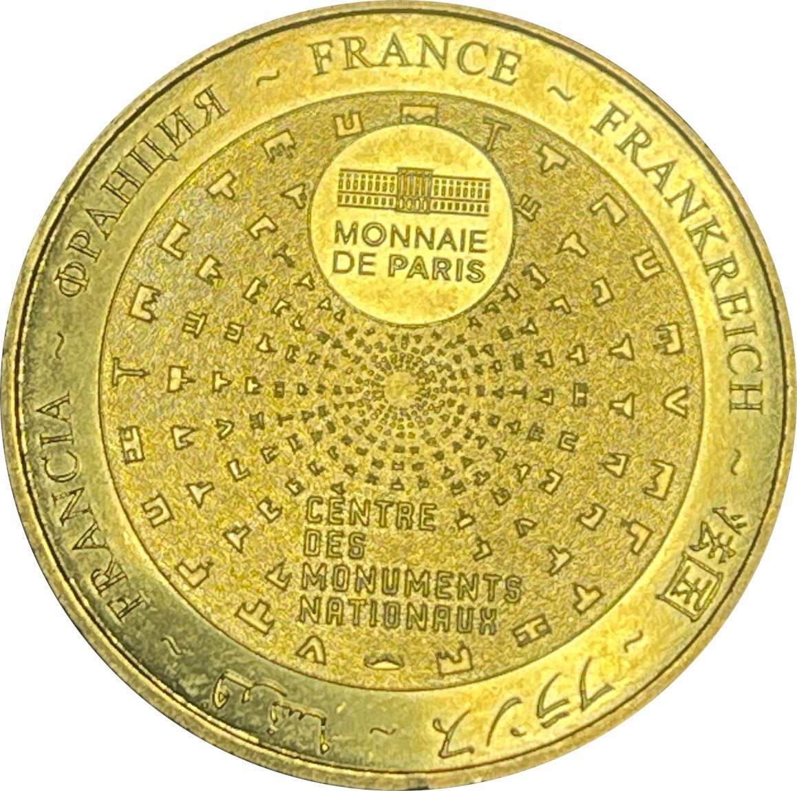 Описание: На периферії слово «Франція» написано сімома мовами. У положенні «12 годин» зображено будівлю Monnaie de Paris у колі. Піктограми Centre des Monuments Nationaux сходяться в центрі.
