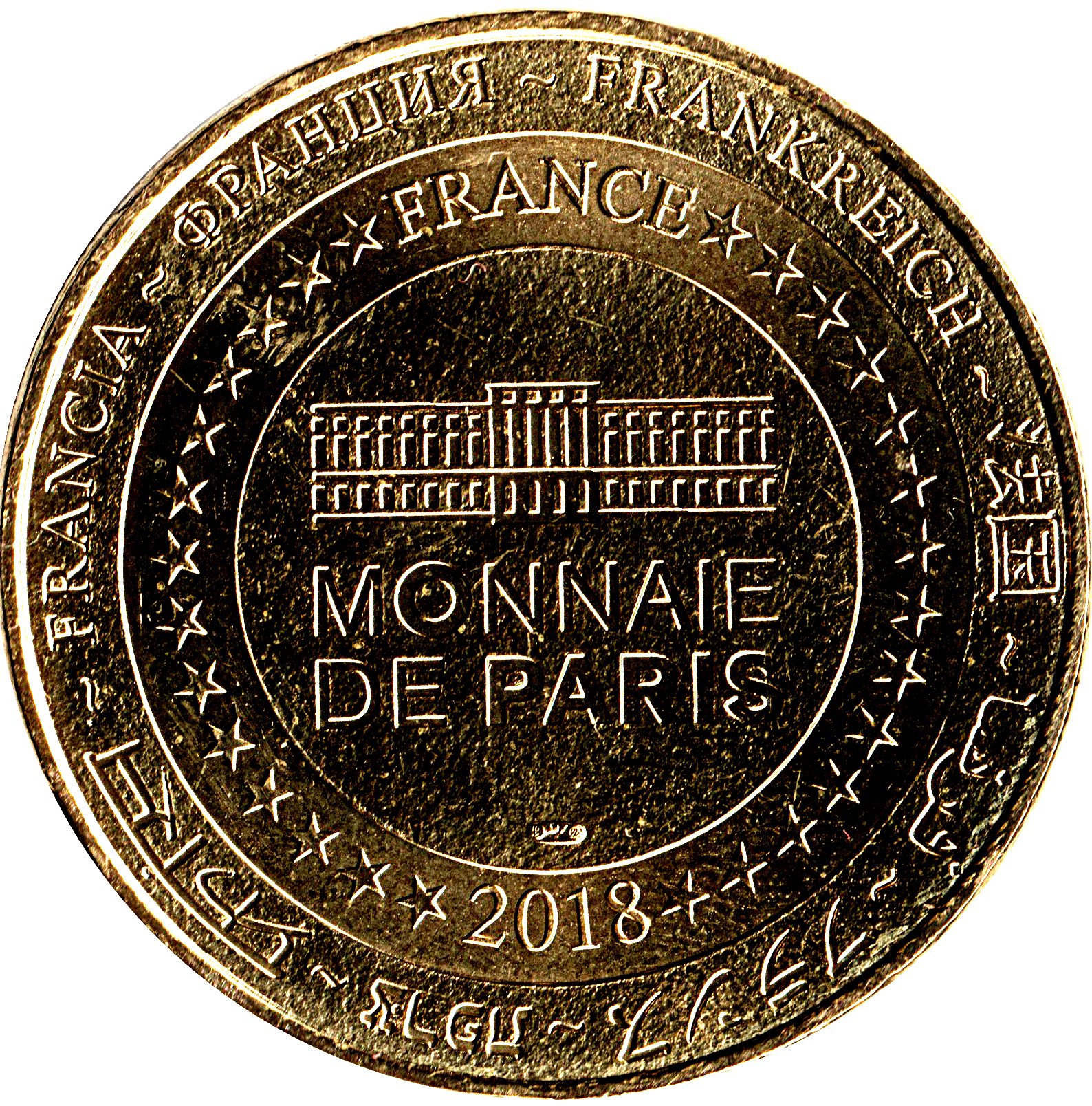 Описание: На периферії слово «Франція» написано вісьмома мовами. Франція на 12-й годині, 2018 рік на 6-й годині, все пов'язане 14 зірками праворуч і ліворуч. У центрі — будівля Моне-де-Парі.
