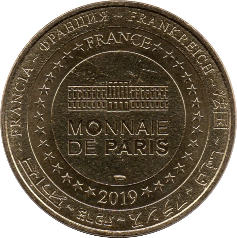 Описание: На периферії слово «Франція» вісьмома мовами. Франція на 12-й годині, 2019 рік на 6-й годині, все пов'язане 14 зірками праворуч і ліворуч. У центрі — будівля Monnaie de Paris.