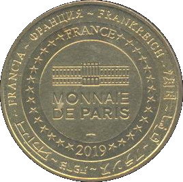 Описание: На периферії слово «Франція» написано вісьмома мовами. Франція на 12-й годині, 2019 рік на 6-й годині, все пов'язано 14 зірками праворуч і ліворуч. У центрі будівля Monnaie de Paris у колі.