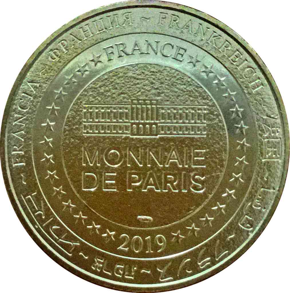 Описание: На периферії слово «Франція» написано вісьмома мовами. Франція на 12-й годині, 2019 рік на 6-й годині, все пов'язане 14 зірками праворуч і ліворуч. У центрі — будівля Монетного двору Парижа.