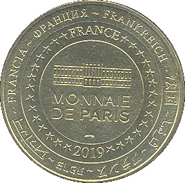 Описание: На периферії слово «Франція» написано вісьмома мовами. Франція на 12-й годині, 2019 рік на 6-й годині, все пов'язане 14 зірками праворуч і ліворуч. У центрі — будівля Монетного двору Парижа.
