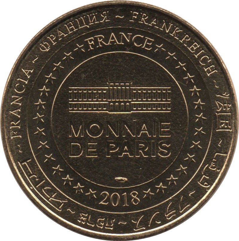 Описание: На периферії слово «Франція» написано вісьмома мовами. Франція на 12-й годині, 2018 рік на 6-й годині, все пов'язане 14 зірками праворуч і ліворуч. У центрі — будівля Моне-де-Парі.