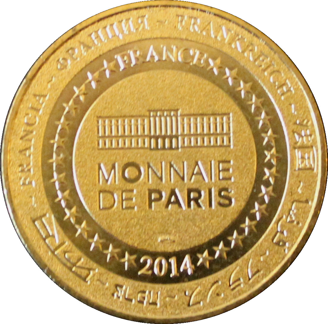 Описание: На периферії слово «Франція» написано вісьмома мовами. Франція на 12-й годині, 2014 рік на 6-й годині, все пов'язане 14 зірками праворуч і ліворуч. У центрі — будівля Monnaie de Paris. Слово «PARIS» виділено жирним шрифтом для року 2014.