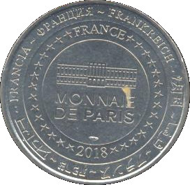 Описание: На периферії слово «Франція» написано вісьмома мовами. Франція на 12-й годині, 2018 рік на 6-й годині, все пов'язане 14 зірками праворуч і ліворуч. У центрі — будівля Моне-де-Парі.