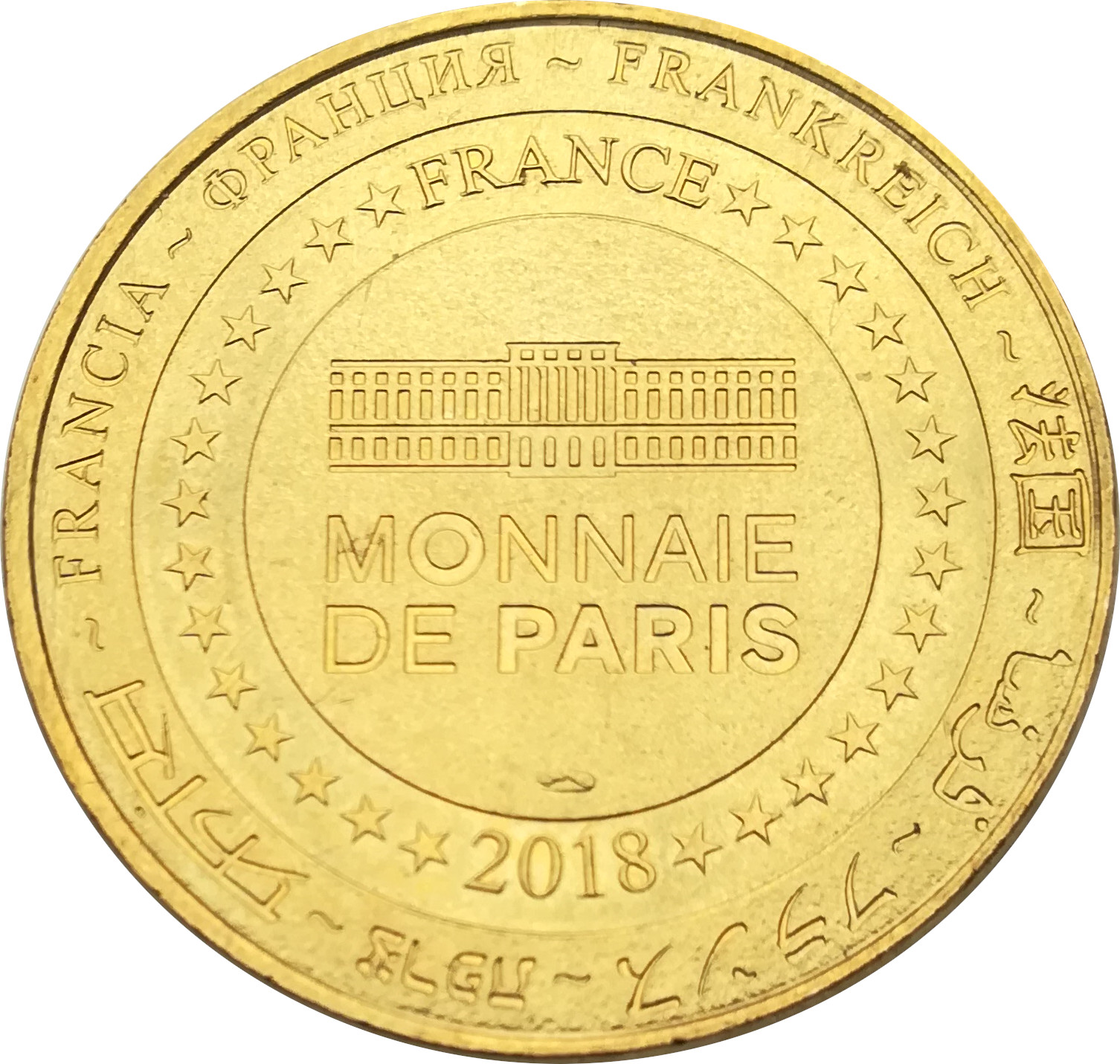 Описание: На периферії слово «Франція» написано вісьмома мовами. Франція на 12-й годині, 2018 рік на 6-й годині, все пов'язане 14 зірками праворуч і ліворуч. У центрі — будівля Моне-де-Парі.