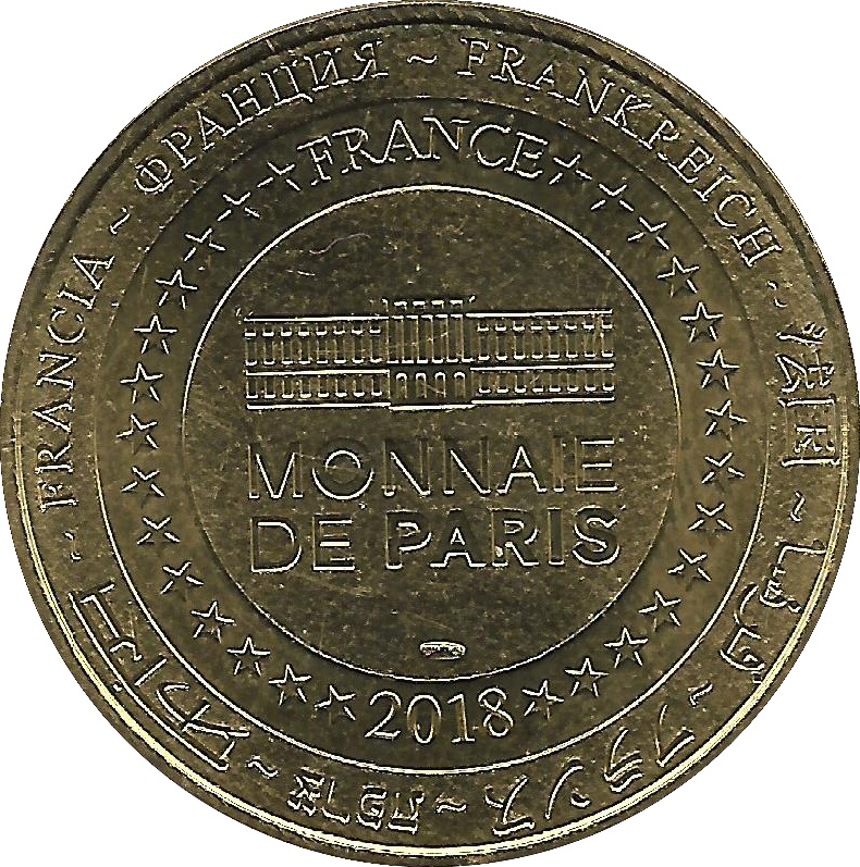 Описание: На периферії слово «Франція» написано вісьмома мовами. Франція на 12-й годині, 2018 рік на 6-й годині, все пов'язане 14 зірками праворуч і ліворуч. У центрі — будівля Моне-де-Парі.