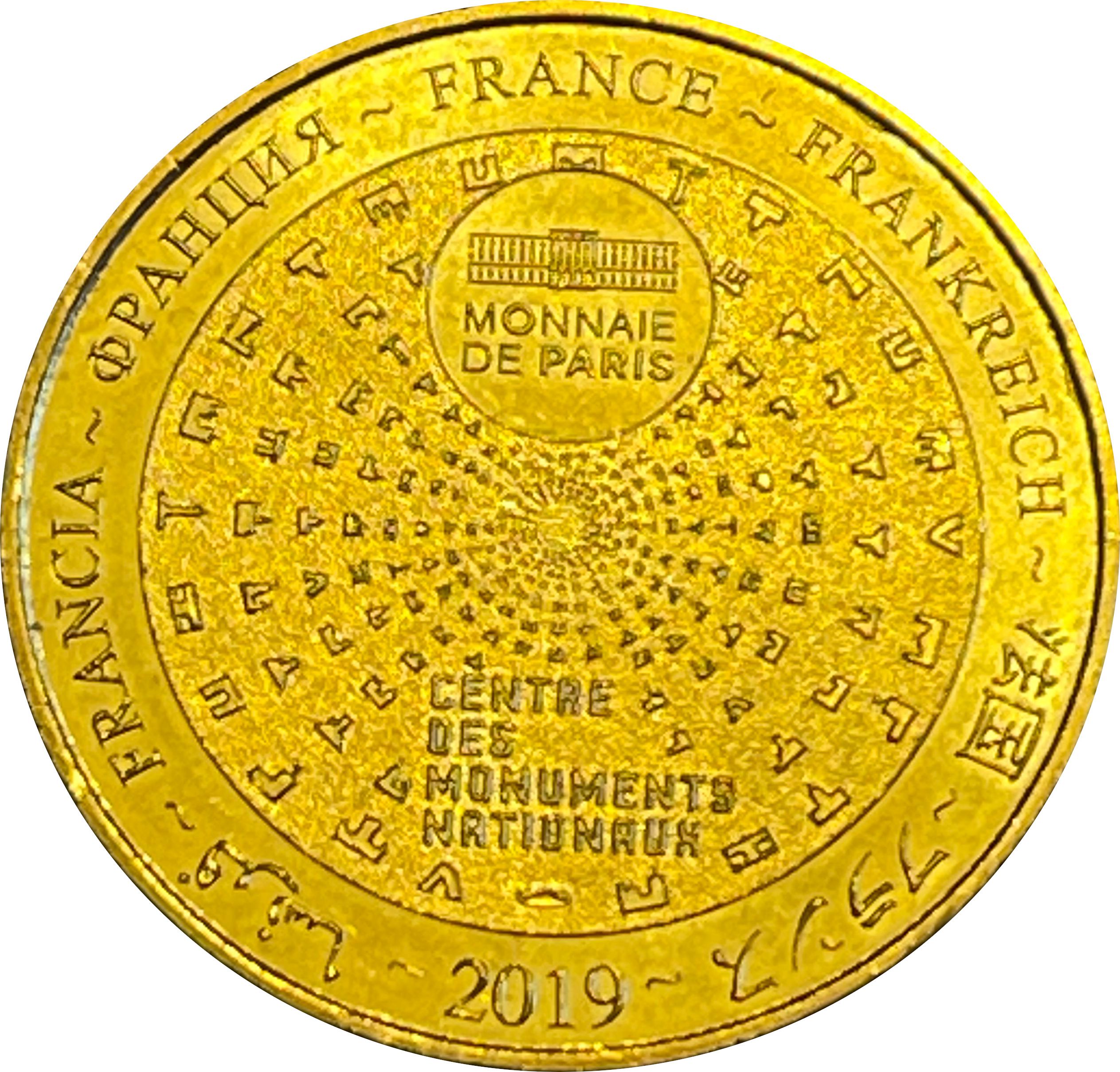 Описание: На периферії слово «Франція» написано сімома мовами. У положенні «12 годин» зображено будівлю Monnaie de Paris у колі. Піктограми Centre des Monuments Nationaux сходяться в центрі.