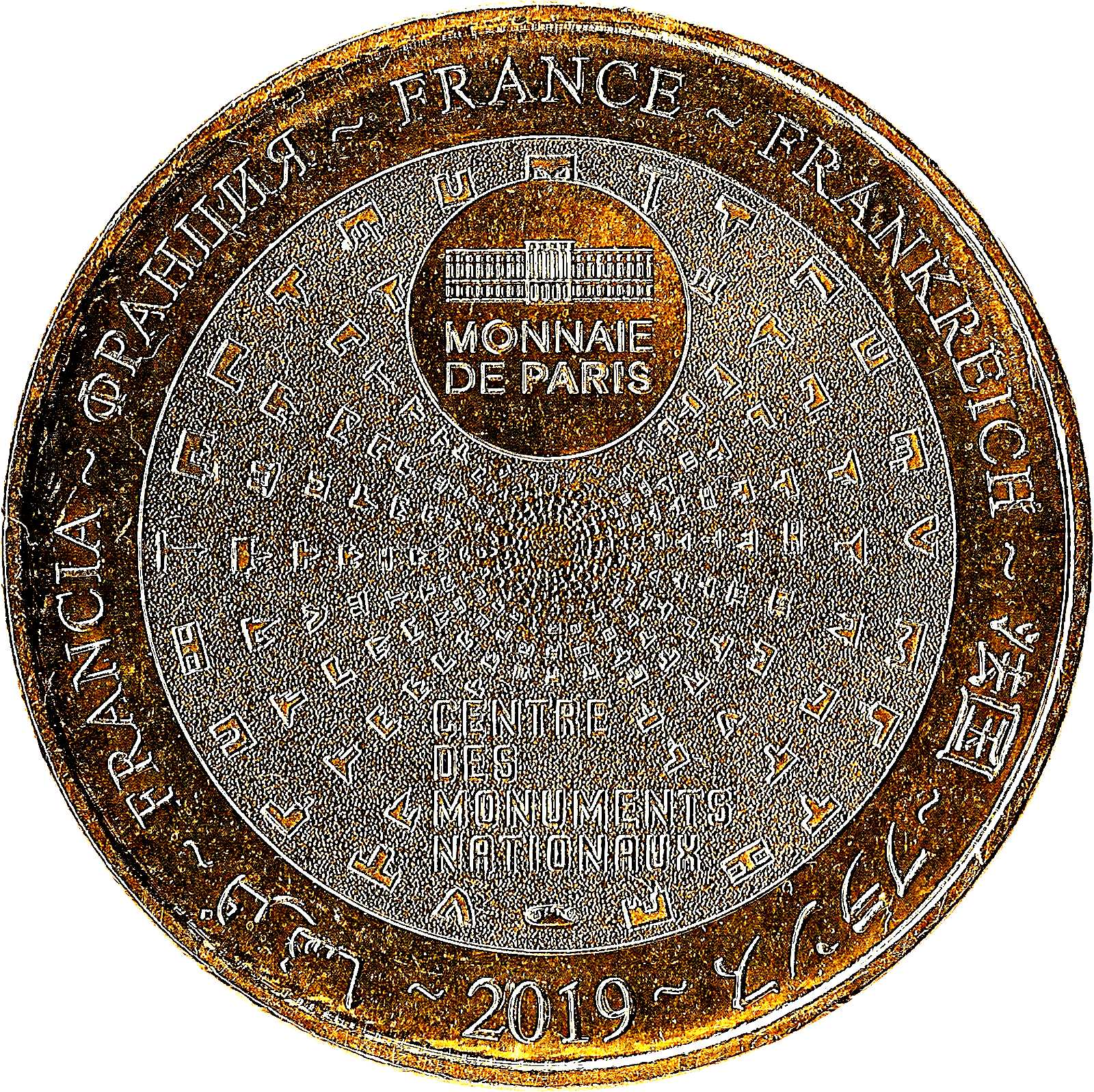 Описание: На периферії слово «Франція» написано шістьма мовами. На 12-й годині — будівля Monnaie de Paris. Піктограми Centre des Monuments Nationaux сходяться до центру.