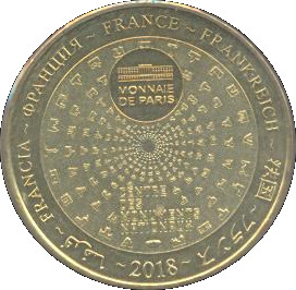 Описание: На периферії слово «Франція» написано сімома мовами. У положенні «12 годин» зображено будівлю Monnaie de Paris у колі. Піктограми Centre des Monuments Nationaux сходяться в центрі.