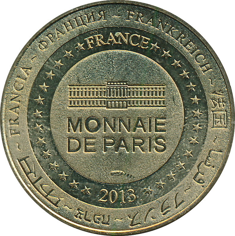 Описание: На периферії слово «Франція» написано вісьмома мовами. Франція на 12-й годині, 2013 рік на 6-й годині, все пов'язане 14 зірками праворуч і ліворуч. У центрі — будівля Монетного двору Парижа.