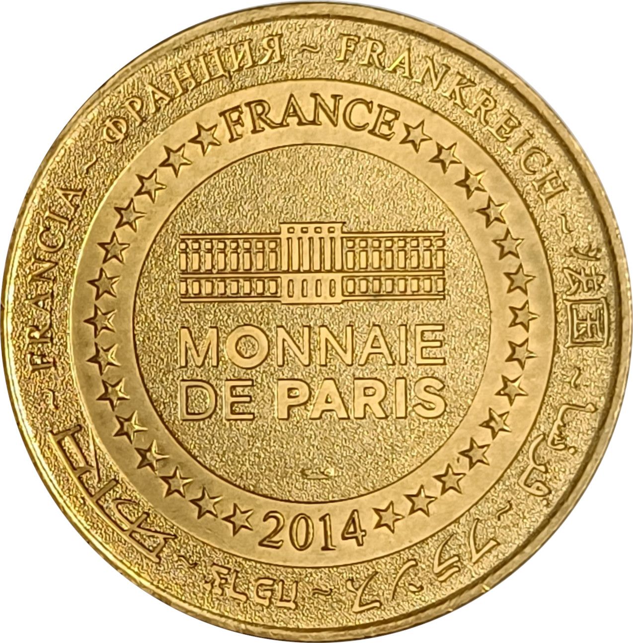 Описание: На периферії слово «Франція» написано вісьмома мовами. Франція на 12-й годині, 2014 рік на 6-й годині, все пов'язане 14 зірками праворуч і ліворуч. У центрі — будівля Моне де Парі.