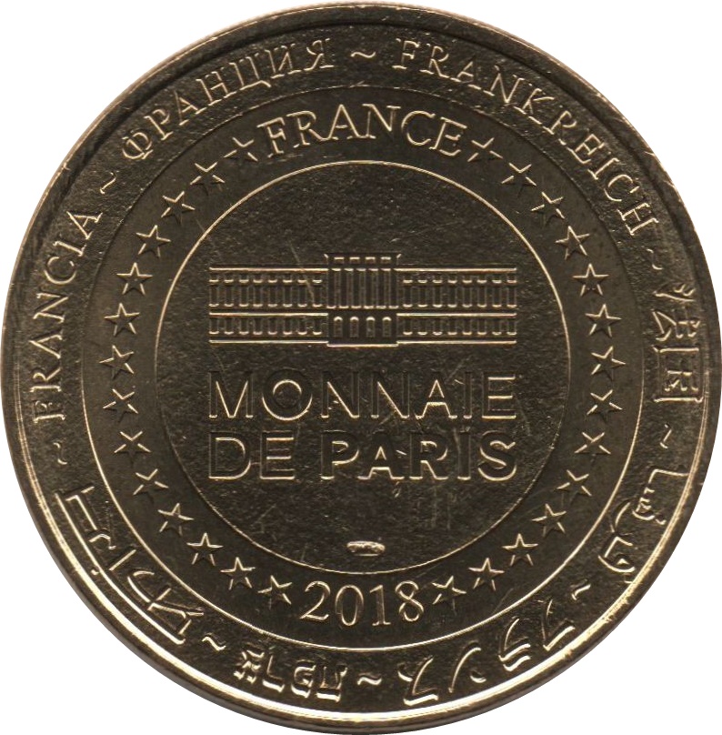 Описание: На периферії слово «Франція» написано вісьмома мовами. Франція на 12-й годині, 2018 рік на 6-й годині, все пов'язане 14 зірками праворуч і ліворуч. У центрі — будівля Моне де Парі.