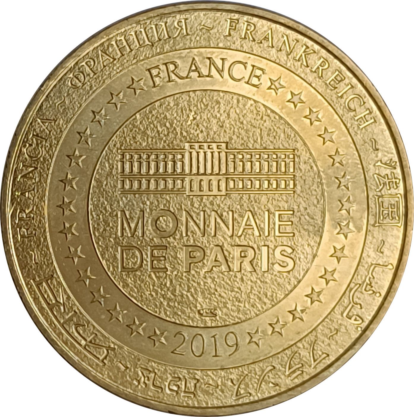 Описание: На периферії слово «Франція» написано вісьмома мовами. Франція на 12-й годині, 2019 рік на 6-й годині, все пов'язане 14 зірками праворуч і ліворуч. У центрі — будівля Монетного двору Парижа.
