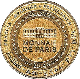 Описание: На периферії слово «Франція» написано вісьмома мовами. Франція на 12-й годині, 2014 рік на 6-й годині, все пов'язане 14 зірками праворуч і ліворуч. У центрі — будівля Моне-де-Парі.