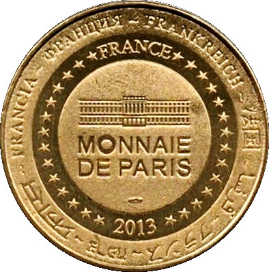 Описание: На периферії слово «Франція» написано вісьмома мовами. Франція на 12-й годині, 2013 рік на 6-й годині, все пов'язане 14 зірками праворуч і ліворуч. У центрі — будівля Монетного двору Парижа.