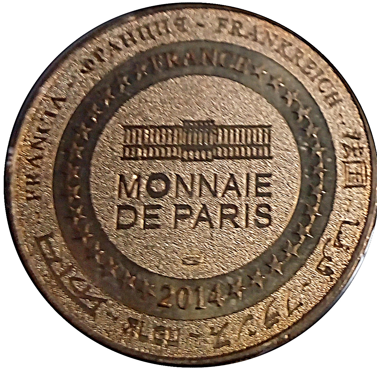 Описание: На периферії слово «Франція» написано вісьмома мовами. Франція на 12-й годині, 2014 рік на 6-й годині, все пов'язане 14 зірками праворуч і ліворуч. У центрі — будівля Моне де Парі. Слово «PARIS» має бути виділено жирним шрифтом для монет 2014 року випуску.