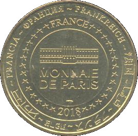 Описание: На периферії слово «Франція» написано вісьмома мовами. Франція на 12-й годині, 2018 рік на 6-й годині, все пов'язане 14 зірками праворуч і ліворуч. У центрі — будівля Моне-де-Парі.