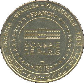 Описание: На периферії слово «Франція» написано вісьмома мовами. Франція на 12-й годині, 2018 рік на 6-й годині, все пов'язано 14 зірками праворуч і ліворуч. У центрі — будівля Монетного двору Парижа.