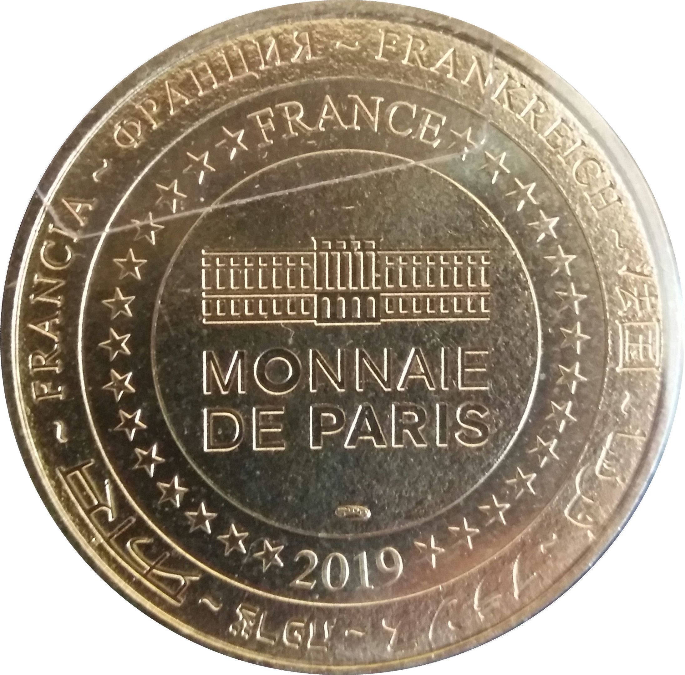 Описание: На периферії слово «Франція» написано вісьмома мовами. Франція на 12-й годині, 2019 рік на 6-й годині, все пов'язане 14 зірками праворуч і ліворуч. У центрі — будівля Моне де Парі.