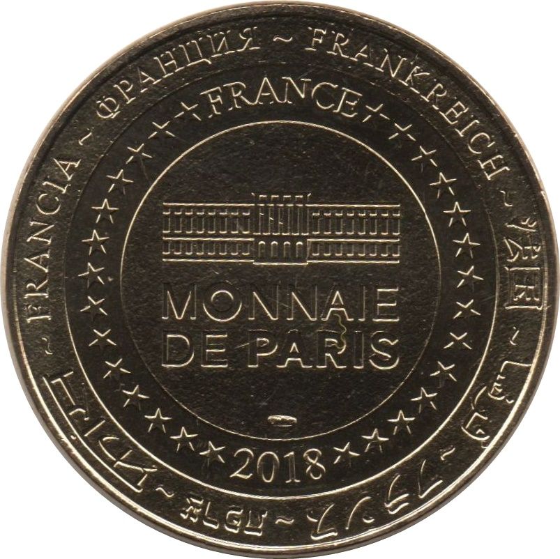 Описание: На периферії слово «Франція» написано вісьмома мовами. Франція на 12-й годині, 2018 рік на 6-й годині, все пов'язано 14 зірками праворуч і ліворуч. У центрі — будівля Монетного двору Парижа.