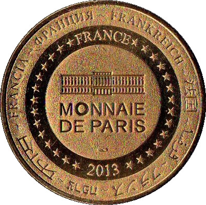 Описание: На периферії слово «Франція» написано вісьмома мовами. Франція на 12-й годині, 2013 рік на 6-й годині, все пов'язане 14 зірками праворуч і ліворуч. У центрі — будівля Моне де Парі.