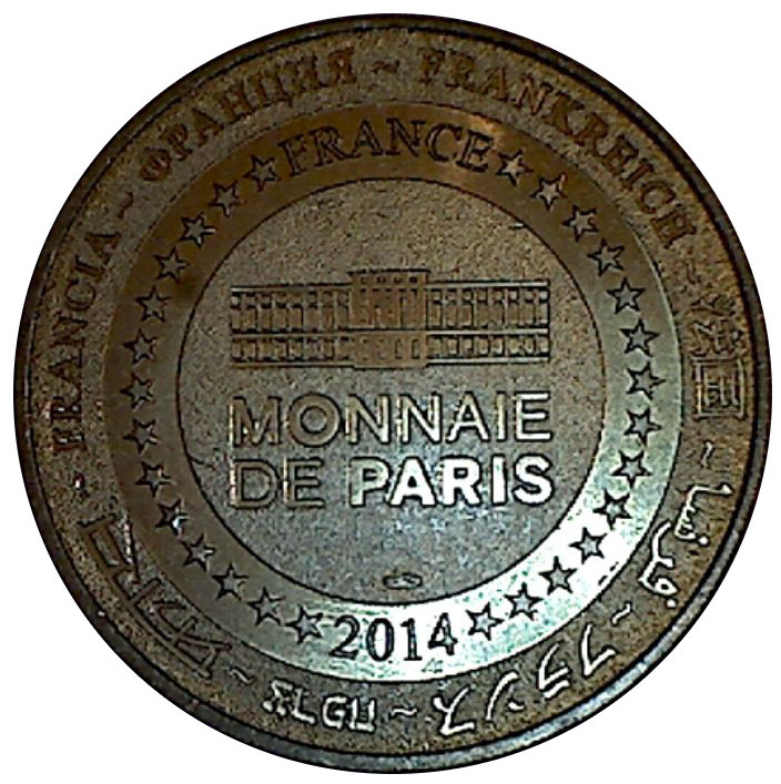 Описание: На периферії слово «Франція» написано вісьмома мовами. Франція на 12-й годині, 2014 рік на 6-й годині, все пов'язане 14 зірками праворуч і ліворуч. У центрі — будівля Монетного двору Парижа.