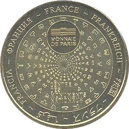 Описание: На периферії слово «Франція» написано сімома мовами. У положенні «12 годин» зображено будівлю Monnaie de Paris у колі. Піктограми Centre des Monuments Nationaux сходяться в центрі.