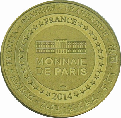 Описание: На периферії слово «Франція» написано вісьмома мовами. Франція на 12-й годині, 2014 рік на 6-й годині, все пов'язане 14 зірками праворуч і ліворуч. У центрі — будівля Моне де Парі.