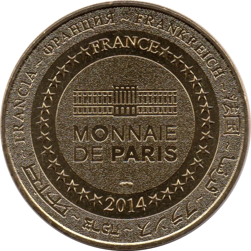 Описание: На периферії слово «Франція» написано вісьмома мовами. Франція на 12-й годині, 2014 рік на 6-й годині, все пов'язане 14 зірками праворуч і ліворуч. У центрі — будівля Моне де Парі.