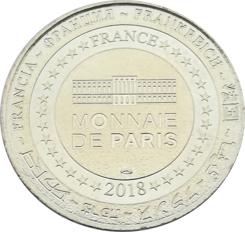 Описание: На периферії слово «Франція» написано вісьмома мовами. Франція на 12-й годині, 2018 рік на 6-й годині, все пов'язано 14 зірками праворуч і ліворуч. У центрі — будівля Паризького валютного банку.