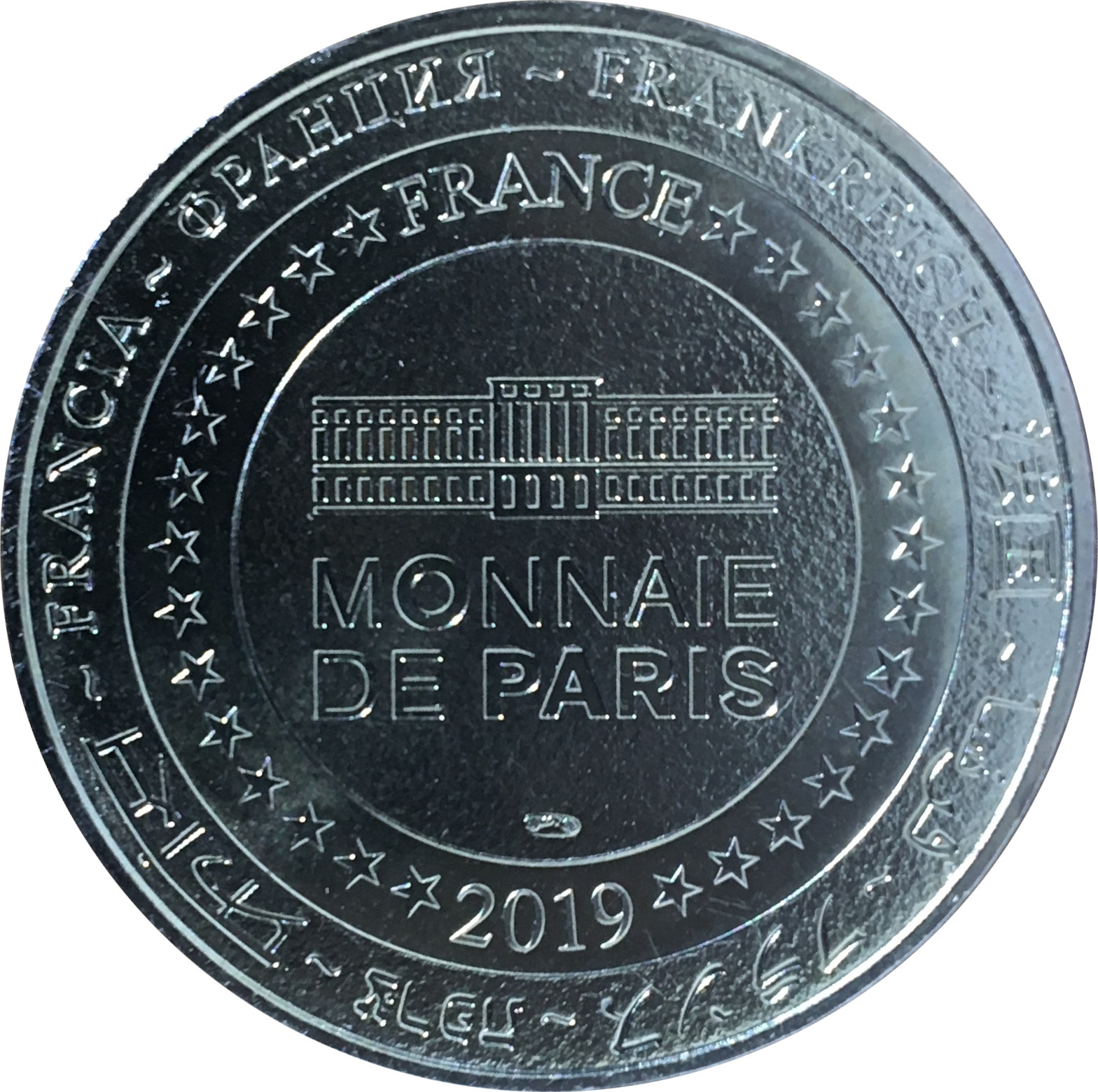 Описание: На периферії слово «Франція» написано вісьмома мовами. Франція на 12-й годині, 2019 рік на 6-й годині, все пов'язане 14 зірками праворуч і ліворуч. У центрі — будівля Монетного двору Парижа.