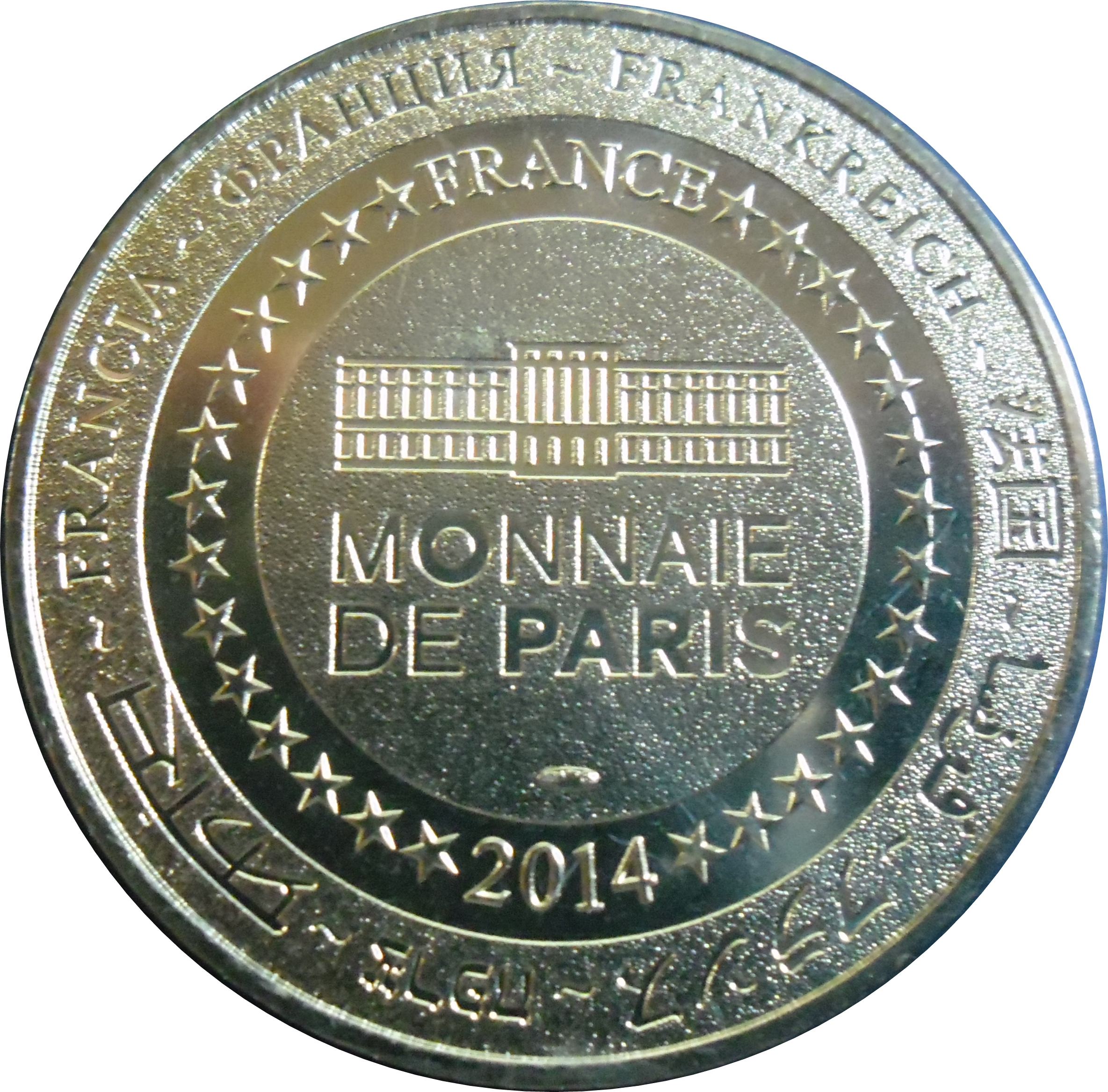 Описание: На периферії слово «Франція» написано вісьмома мовами. Франція на 12-й годині, 2014 рік на 6-й годині, все пов'язане 14 зірками праворуч і ліворуч. У центрі — будівля Моне-де-Парі.