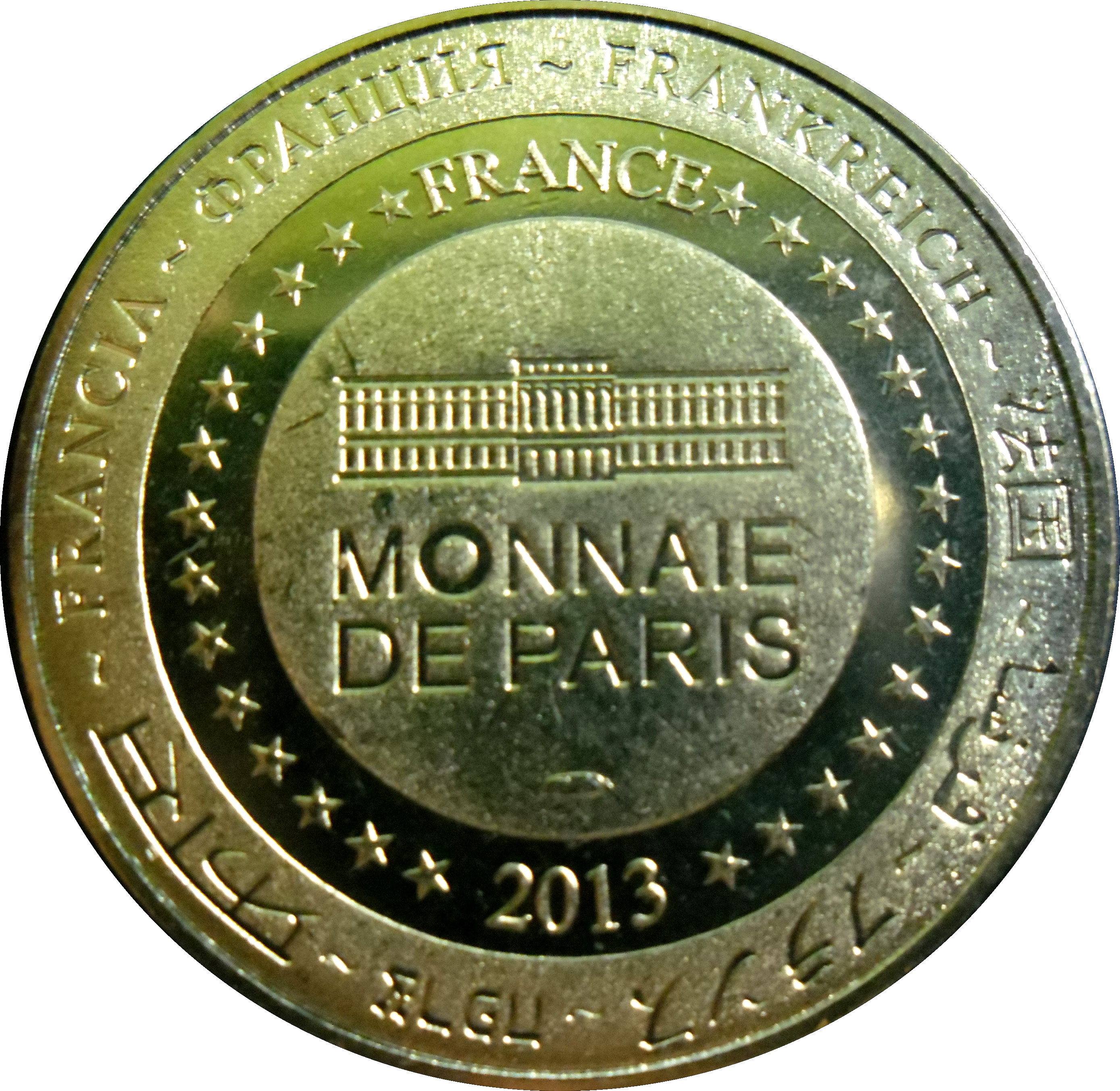 Описание: На периферії слово «Франція» написано вісьмома мовами. Франція на 12-й годині, 2013 рік на 6-й годині, все пов'язане 14 зірками праворуч і ліворуч. У центрі — будівля Монетного двору Парижа.