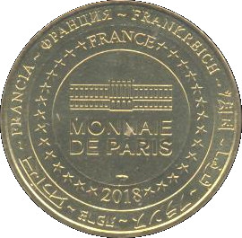 Описание: На периферії слово «Франція» написано вісьмома мовами. Франція на 12-й годині, 2018 рік на 6-й годині, все пов'язане 14 зірками праворуч і ліворуч. У центрі — будівля Моне де Парі.