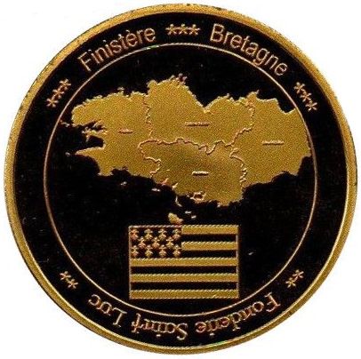 Описание: Карта Бретані з бретонським прапором внизу. «Finistère», «Bretagne» та «Fonderie Saint Luc» написані по колу.