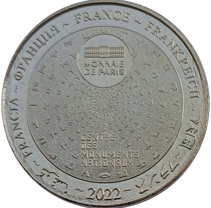 Описание: Французький текст сімома мовами по периферії, перерваний роком. Символ Monnaie de Paris на 12-й годині, оточений різними піктограмами Центру, що сходяться до центру.