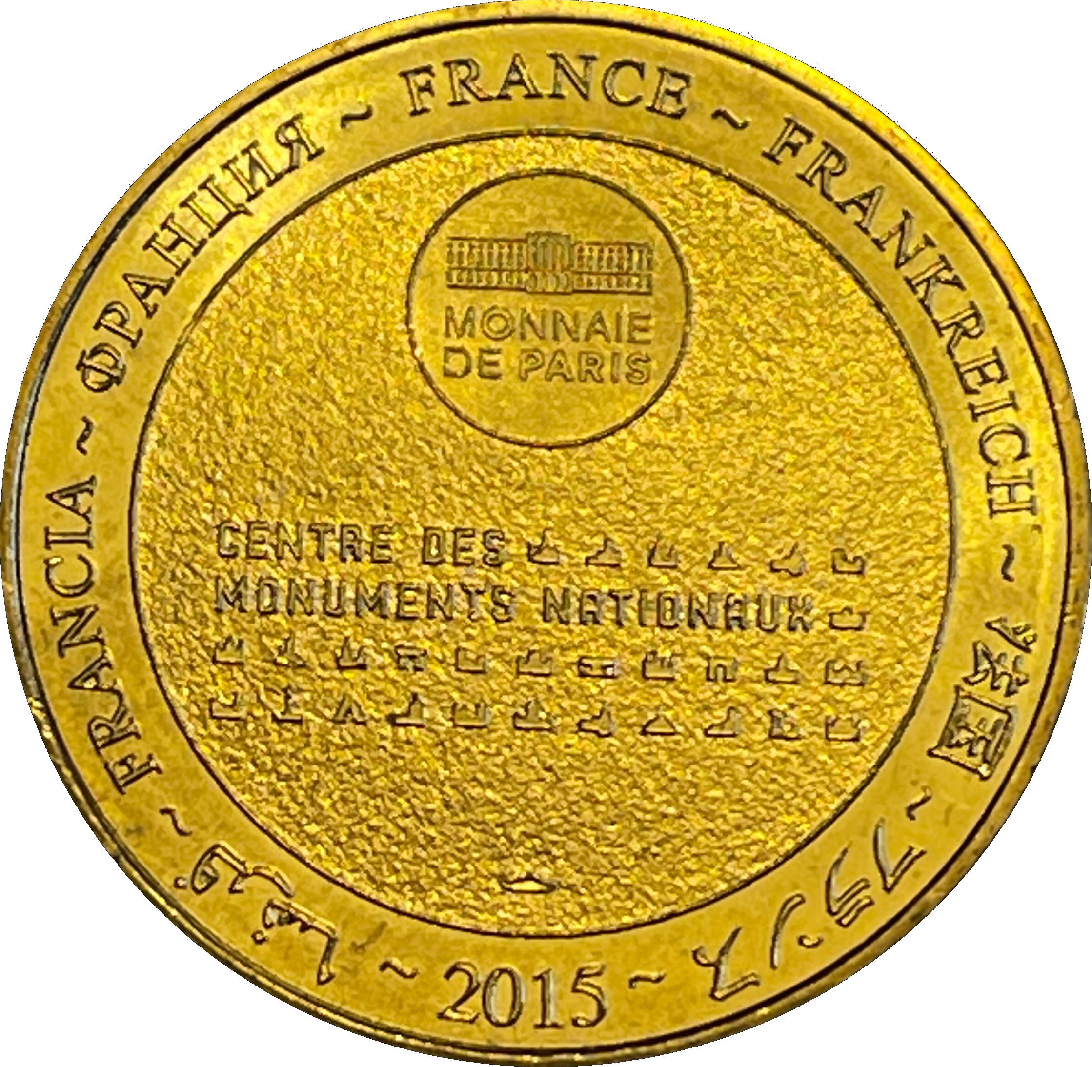 Описание: На периферії слово «Франція» написано вісьмома мовами. Символ Monnaie de Paris на 12-й годині, 2015 рік на 6-й годині. Текст у центрі, за яким йдуть різні піктограми центру.