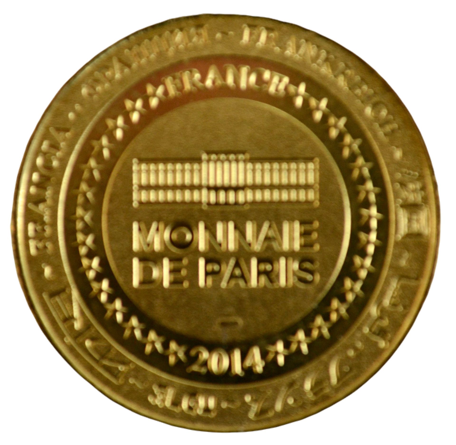 Описание: На периферії слово «Франція» написано вісьмома мовами. Франція на 12-й годині, 2014 рік на 6-й годині, все пов'язане 14 зірками праворуч і ліворуч. У центрі — будівля Моне-де-Парі.