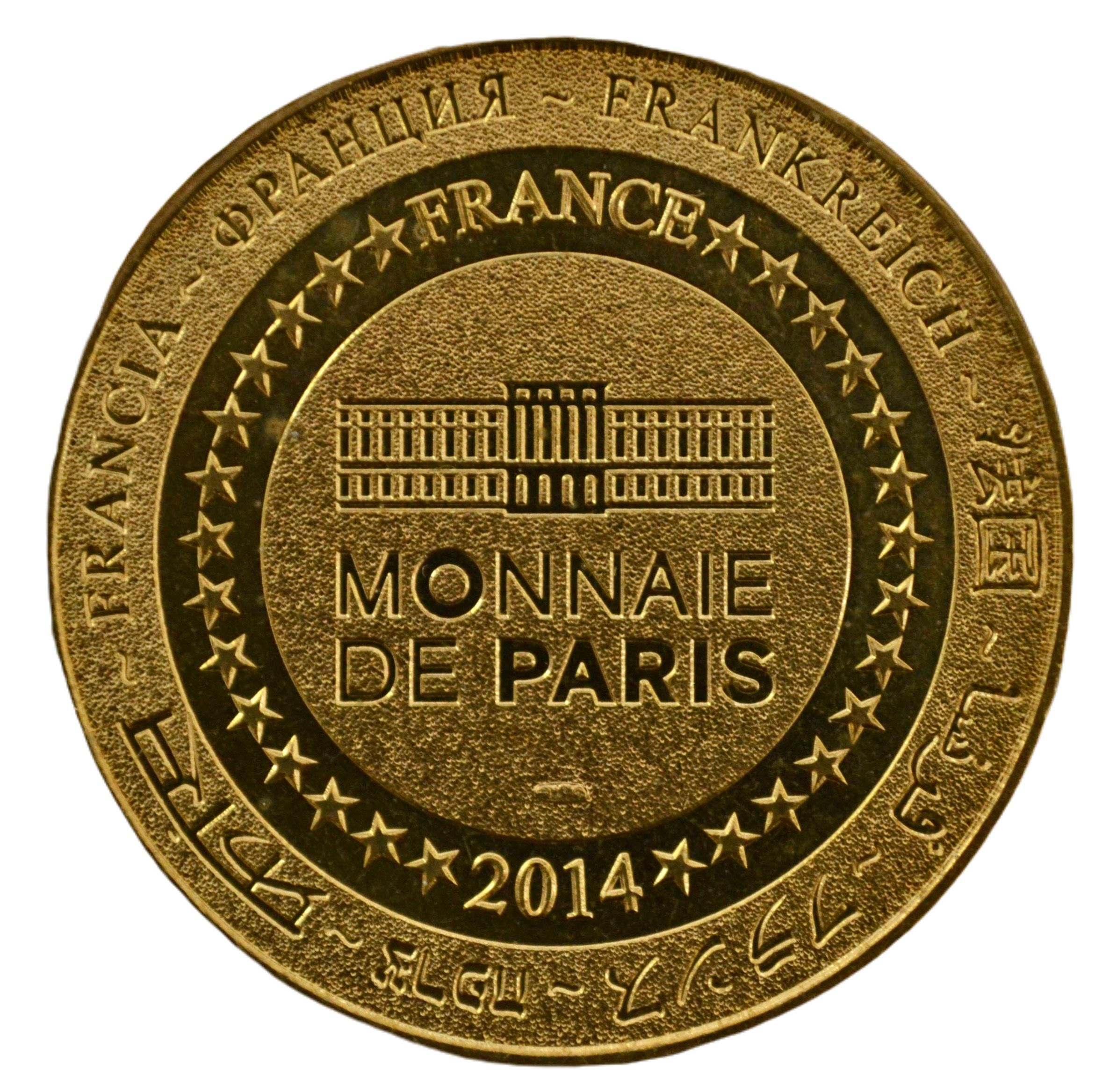 Описание: На периферії слово «Франція» написано вісьмома мовами. Франція на 12-й годині, 2014 рік на 6-й годині, все пов'язане 14 зірками праворуч і ліворуч. У центрі — будівля Моне-де-Парі.