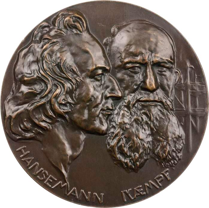 Описание: Два бюсти: Давид Ганземанн повернутий праворуч, а Йоганнес Кемпф — обличчям до глядача, на тлі праворуч — щогли кораблів.