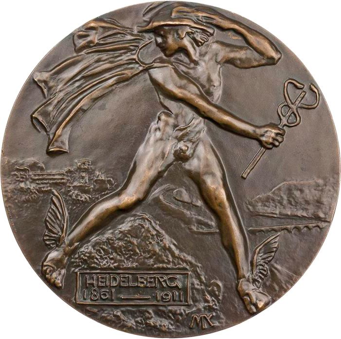 Описание: Оголена фігура Меркурія, що летить над долиною Неккар, дивлячись вліво і тримаючи кадуцей правою рукою, а лівою рукою тримаючи капелюх. Замок Гейдельберга на задньому плані ліворуч.