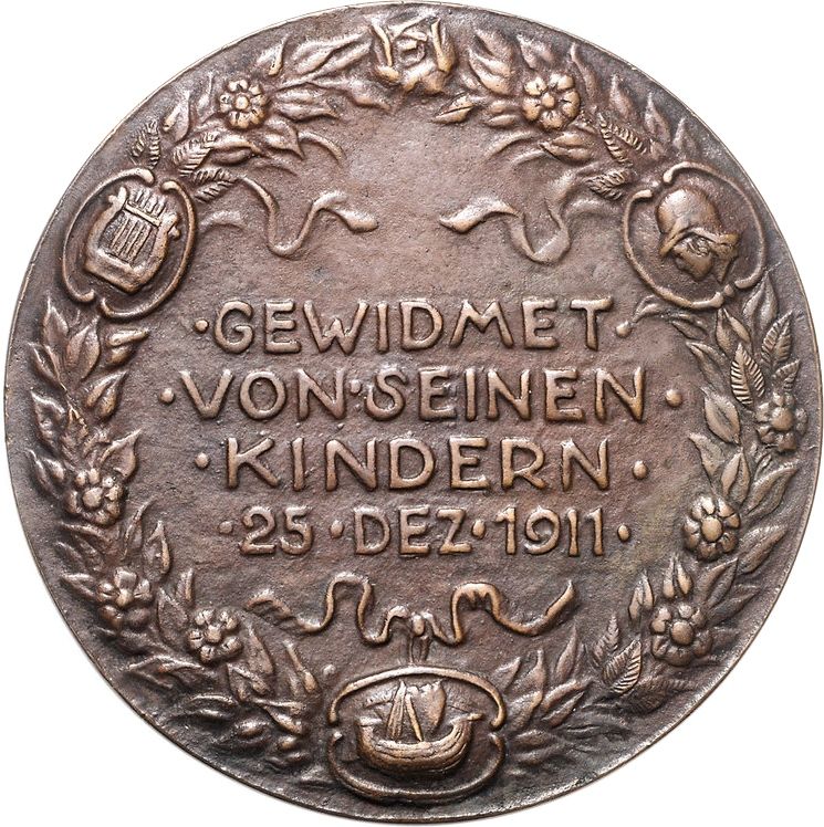 Описание: 4-рядковий напис у квітковому вінку з 3 медальйонами, один із яких зображує бюст у шоломі, другий — корабель, а третій — ліру.